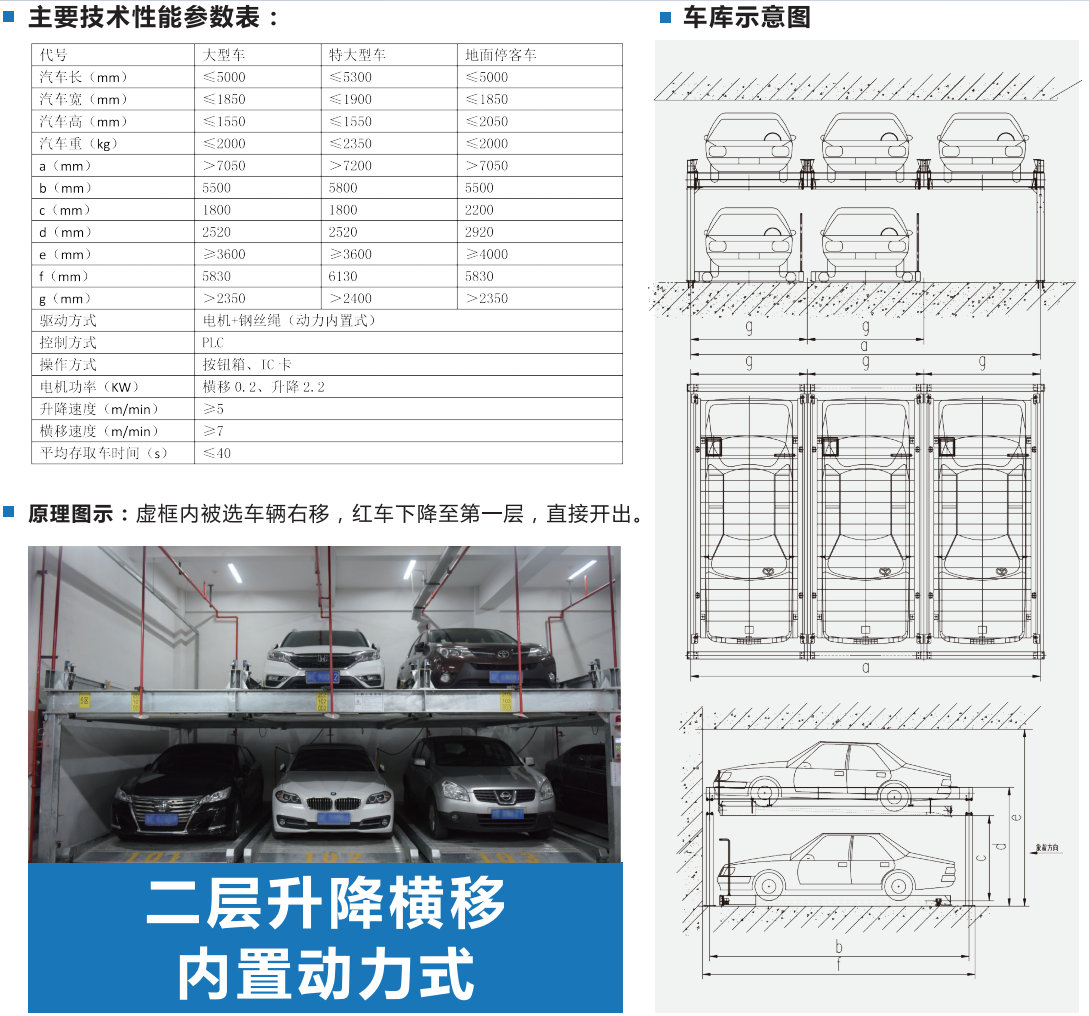 運(yùn)行原理:上層停車板可做上下升降,下層停車板可做左右橫移運(yùn)動(dòng)。下層設(shè)有一個(gè)空位,左右移動(dòng)變換空位,讓空位上方的上層停車板下降至地面,取出汽車。下層停車板上的汽車無需做運(yùn)作,可直接出車。