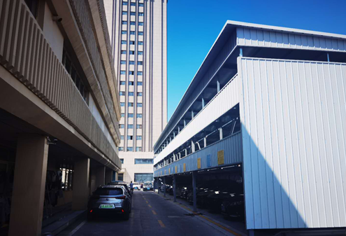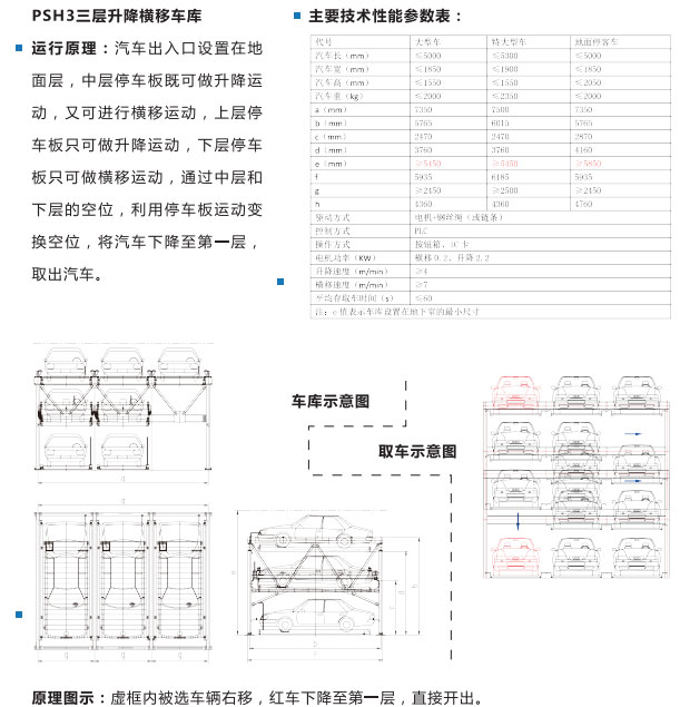 運(yùn)行原理:汽車出入口設(shè)置在地面層,中層停車板既可做升降運(yùn)動(dòng),又可進(jìn)行橫移運(yùn)動(dòng),上層停車板只可做升降運(yùn)動(dòng),下層停車板只可做橫移運(yùn)動(dòng),通過中層和下層的空位,利用停車板運(yùn)動(dòng)變換空位,將汽車下降至第一層,取出汽車。