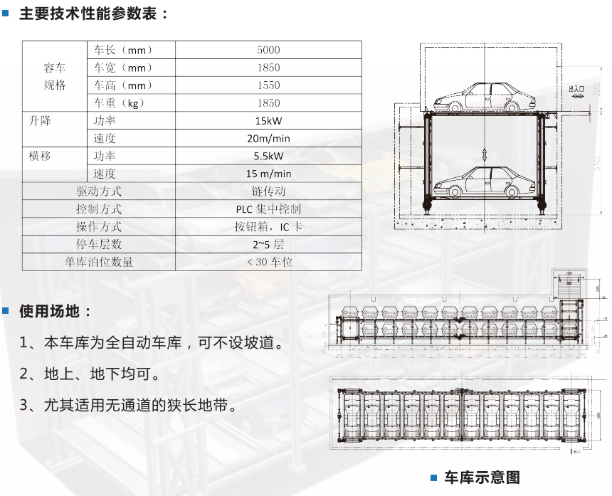 運(yùn)行原理:車輛入庫時,汽車開入與地面相通的升降機(jī)出入平臺,該升降機(jī)將汽車升降到車庫停車泊位所在的層,完成入庫;出庫過程與此相反,由所在層的水平橫移驅(qū)動機(jī)將泊位運(yùn)送到與地面相通的升降機(jī)內(nèi),再由升降機(jī)將汽車送到地面。